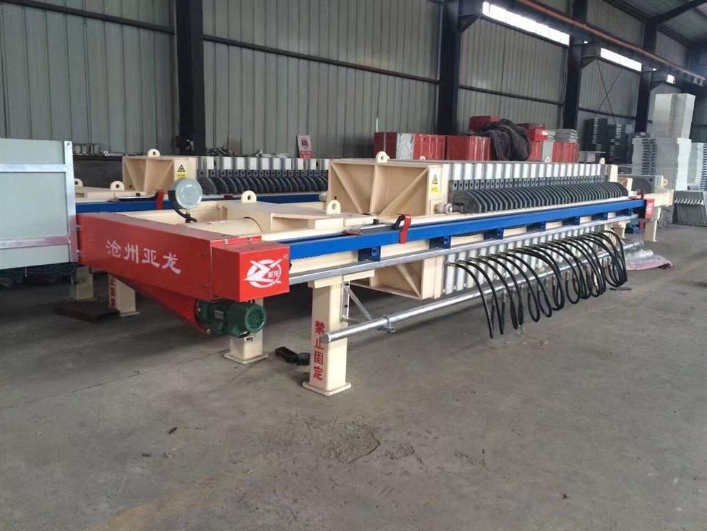 板框壓濾機主要由推力板(固定濾板)、壓縮板(移動式濾板)、濾板和濾架、橫梁(扁鐵框)、濾料(濾布或濾紙等)、壓實裝置、液體集箱等組成。