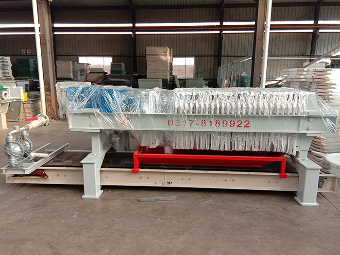 用泵將待過濾的懸浮液輸送到已壓緊的各個濾室中,壓濾機懸浮液中的液體透過濾布,通過各濾板上的濾液孔排至機外,懸浮液中的固體顆粒則積聚于濾室中,并逐漸形成濾餅。